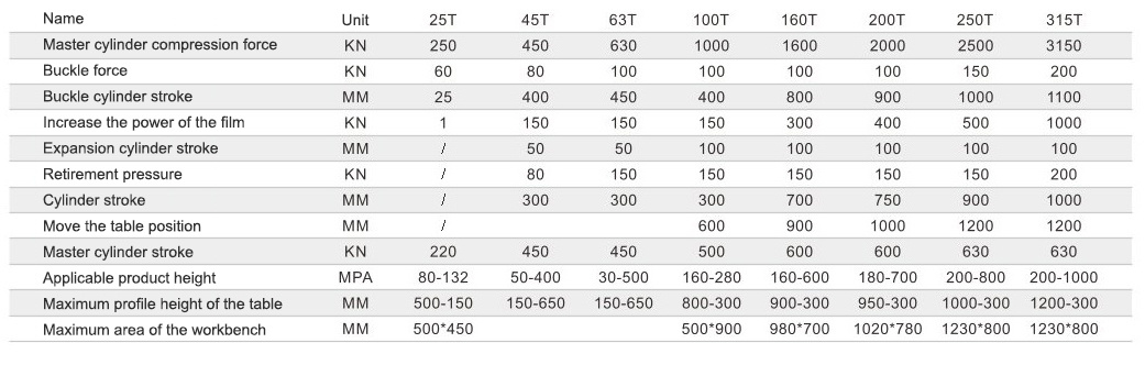 This series of clamping machines mainly consists of a clamping cylinder, a clamping cylinder, a tensioning cylinder, a feeding cylinder, an upper crossbeam, a moving beam, a workbench base, a workbench, a clamping disc, an upper pressure head, a mold (one set of random molds), etc., equipped with a hydraulic station and an electrical cabinet.